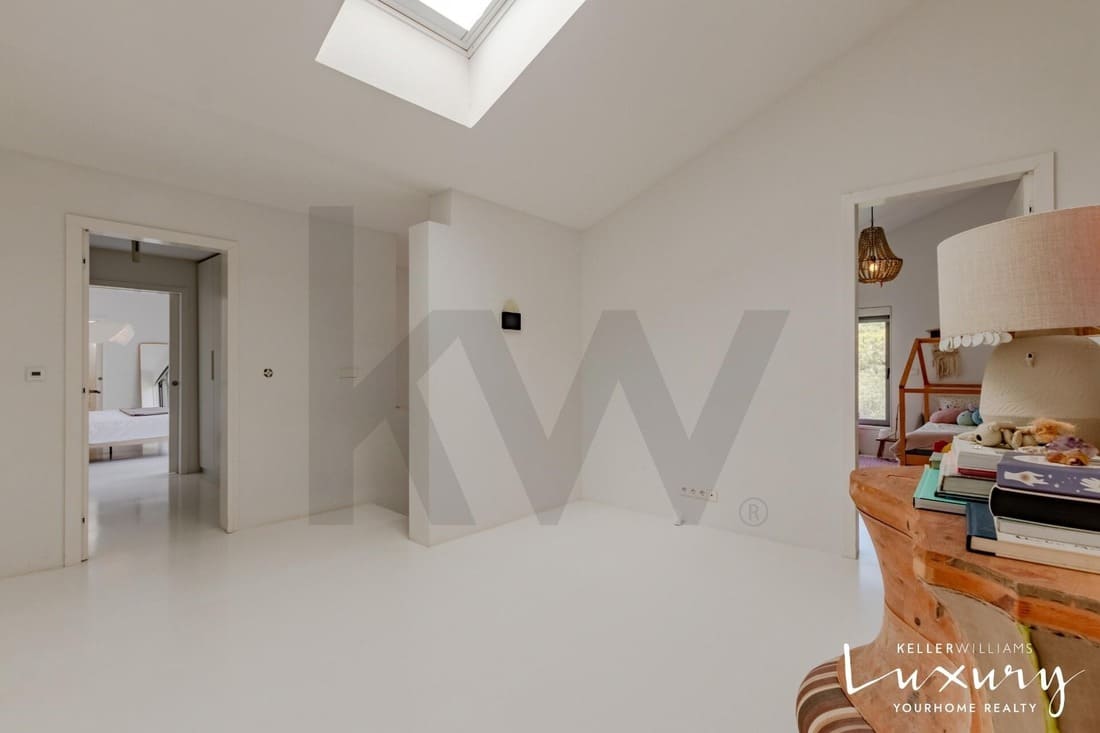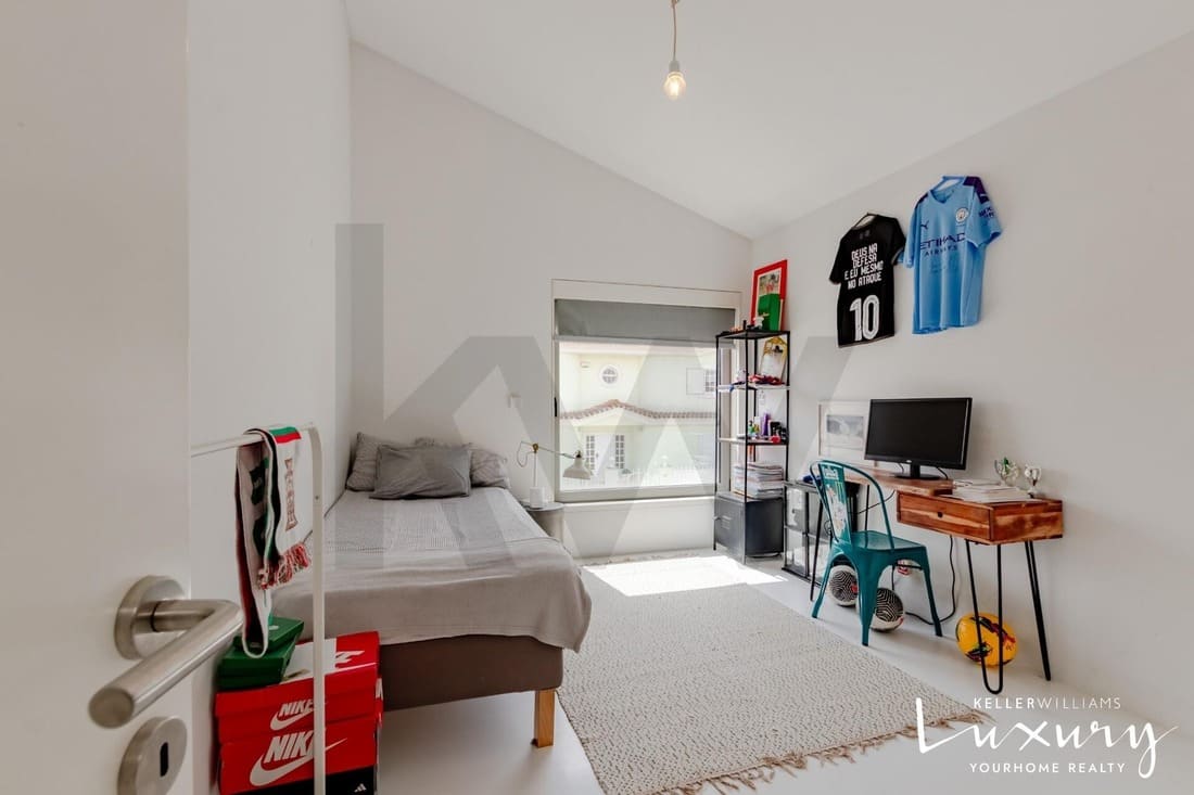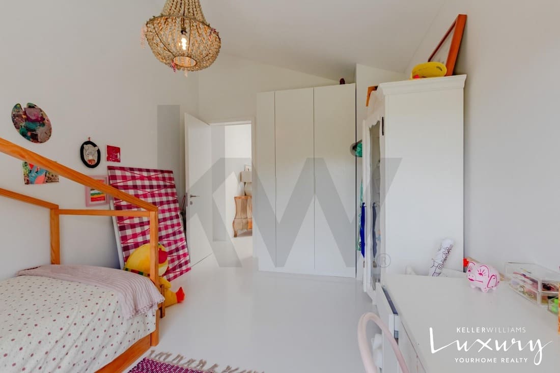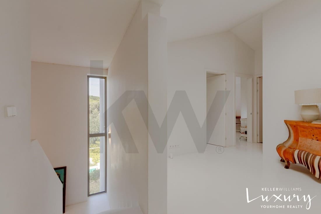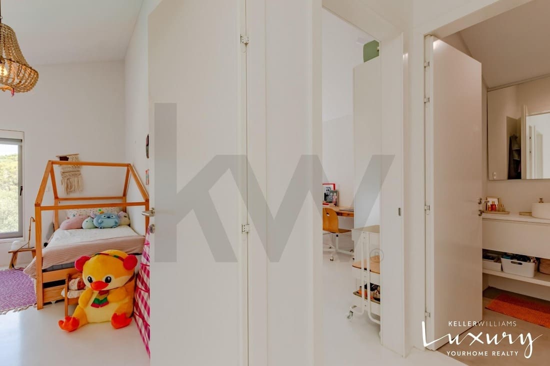 O piso superior acolhe a master suite com varanda privativa, casa de banho espaçosa e elevada luminosidade. Existem ainda quatro quartos adicionais, apoiados por duas casas de banho completas, todos distribuídos em torno de um amplo hall com janela de teto tipo VELUX, proporcionando uma agradável entrada de luz natural.
